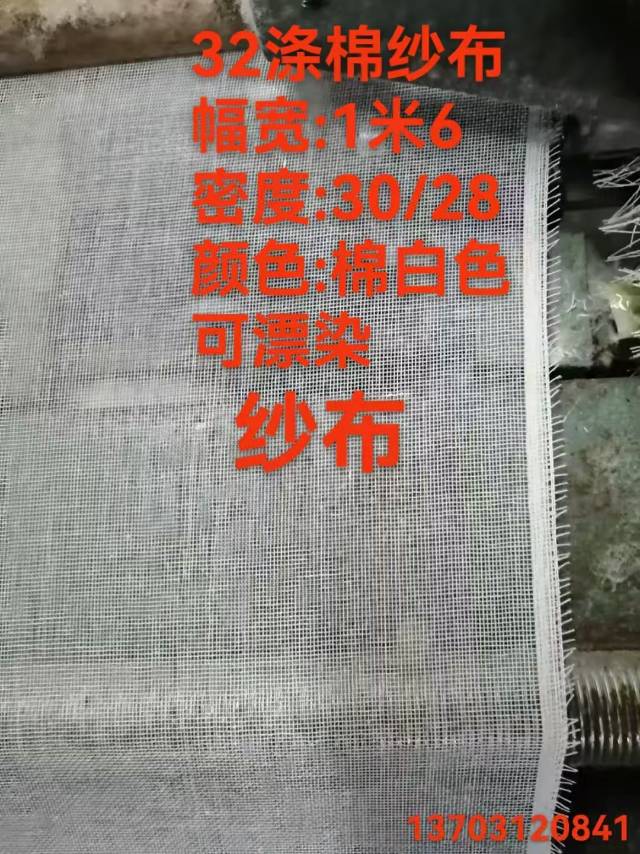 32支涤棉纱布,幅宽1.6米,1.65米,1.8米 2.3米和2.4米 |