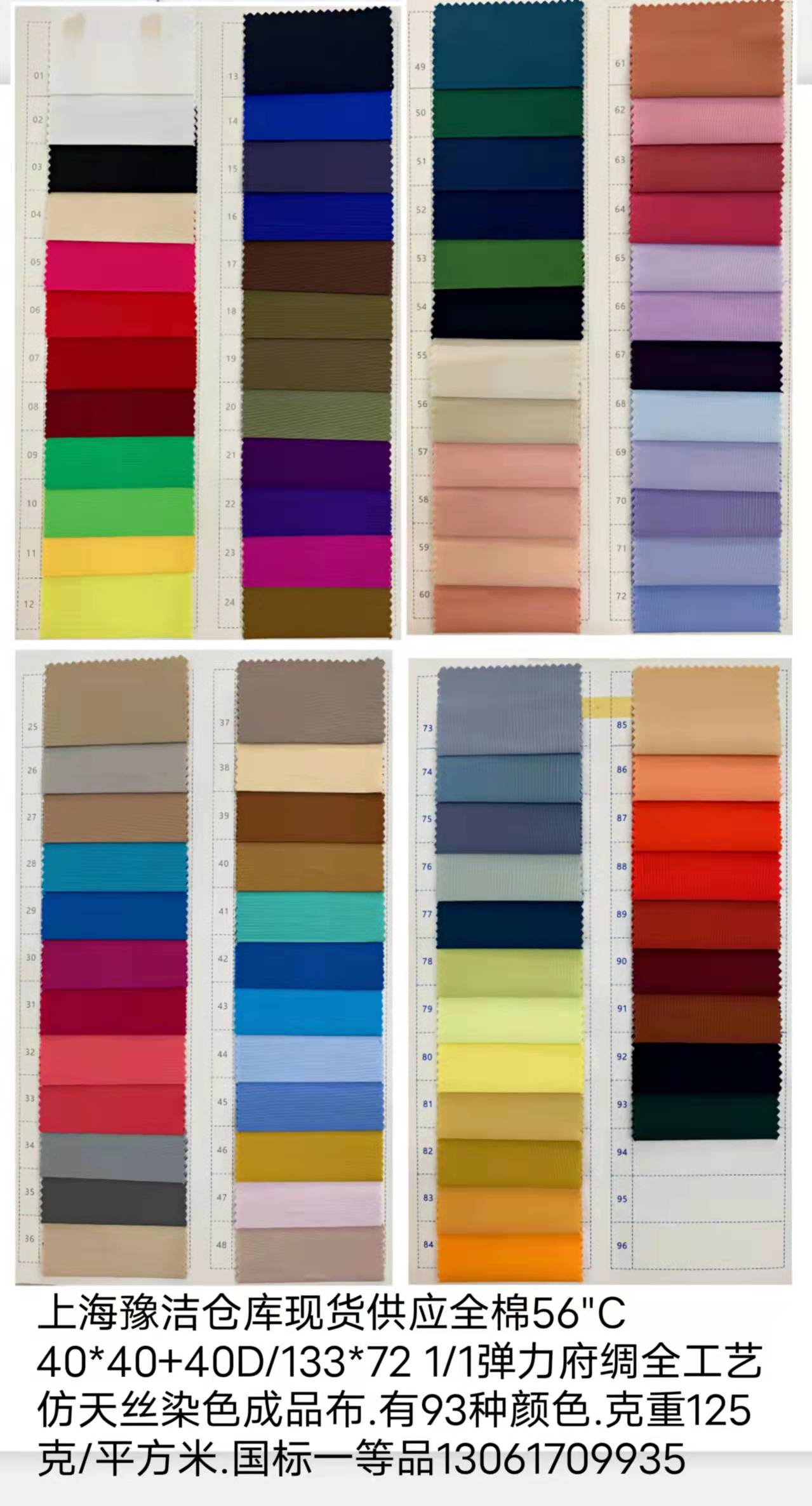 描述: 58“C 40x40+40D/133x72弹力府绸全工艺染色成品布,长车全工艺染色成品布有93种颜色,成品克重125克/平方米,适合做高档服装面料,时装面料,衬衫面料,色牢度4级左右,国标一等品,卷装120码左右一匹,700米一件。上海仓库常年现货供应。