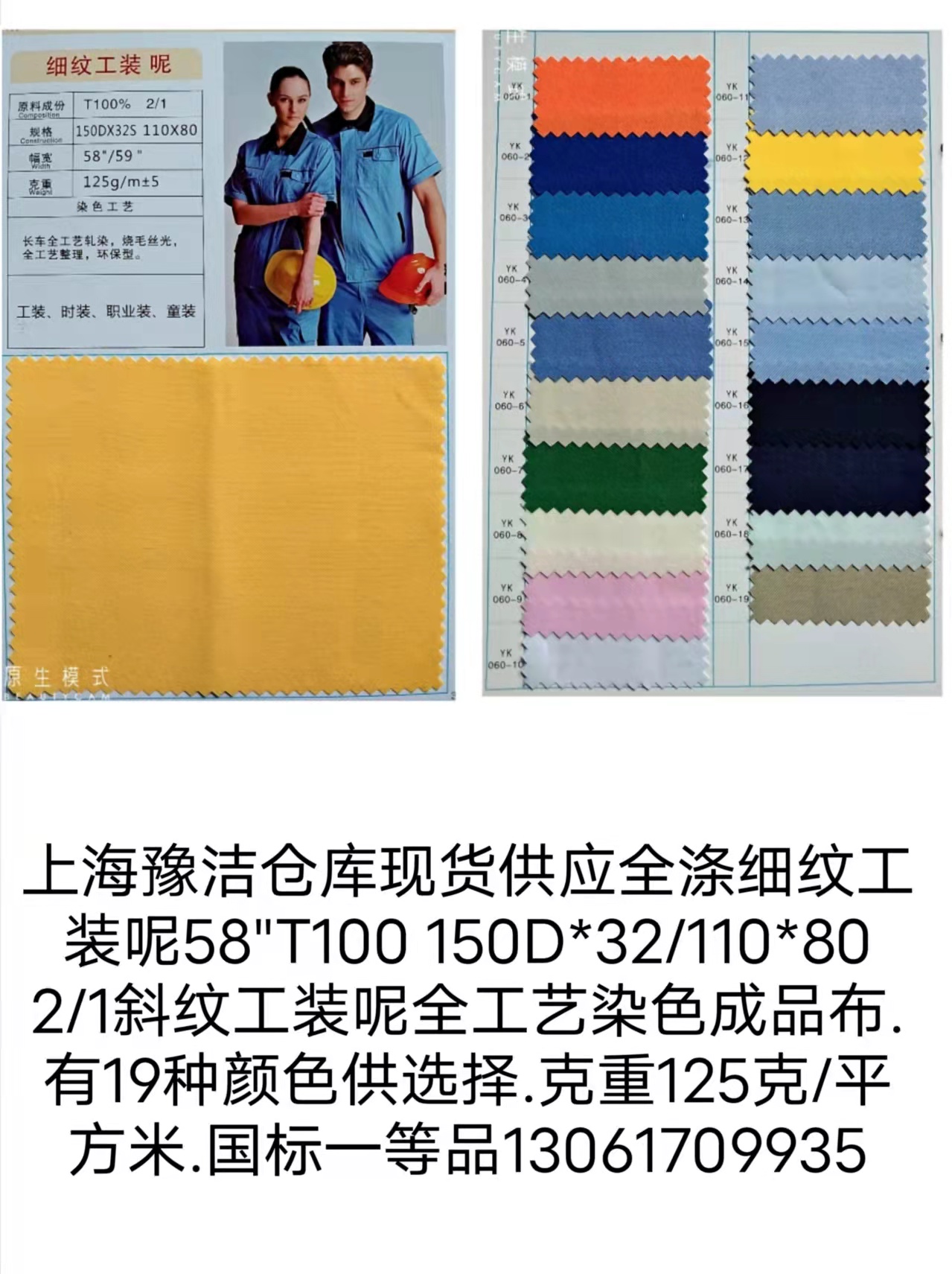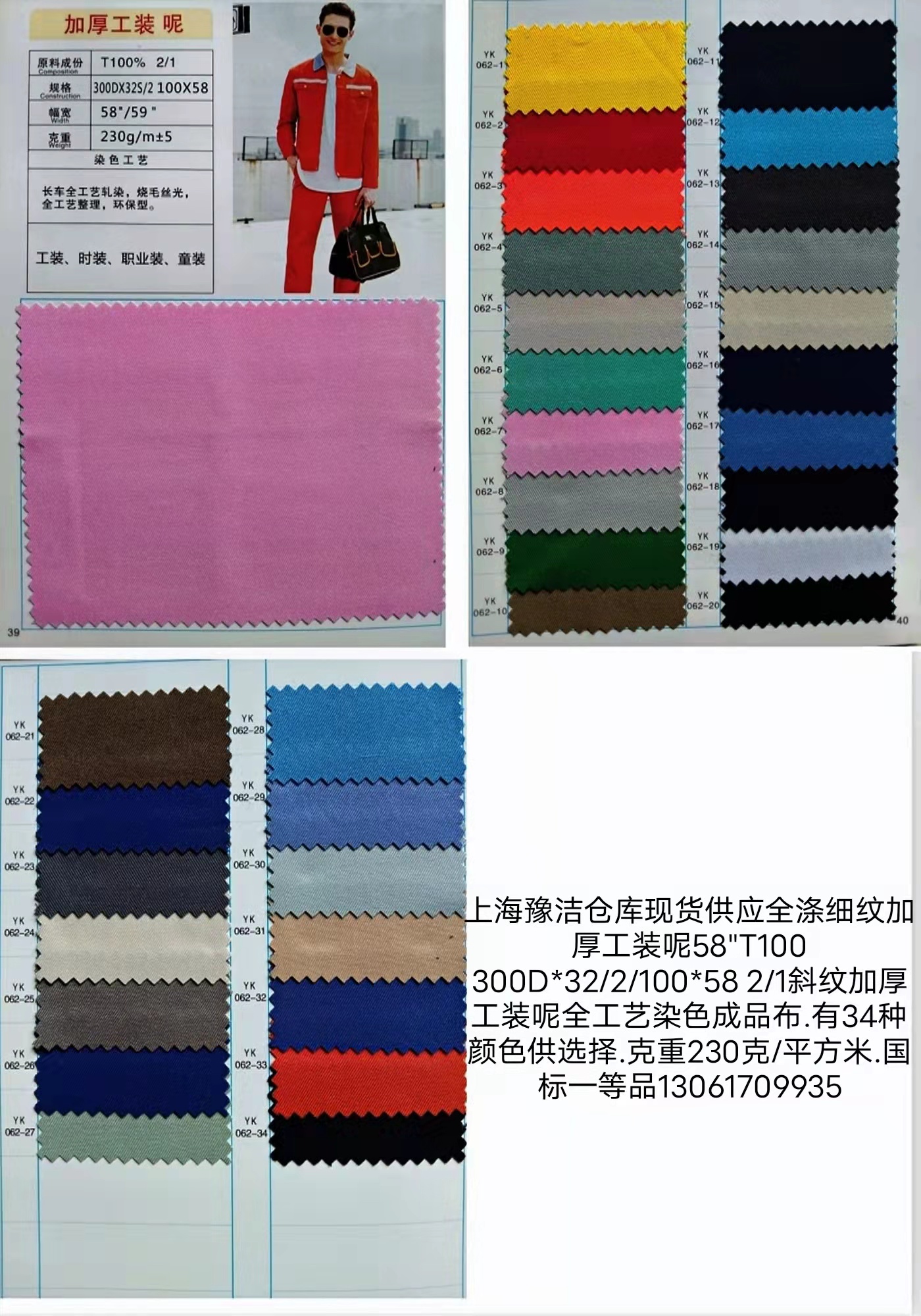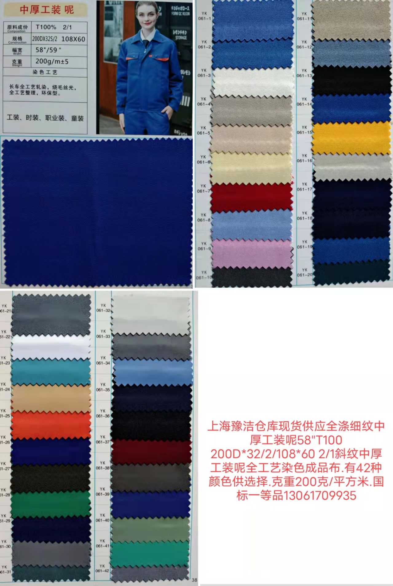 描述: 58“T100 200D*32/2/100*58 2/1细纹加厚工装呢全工艺染色成品布,有34种颜色供选择,克重230克/平方米,110米左右一匹,国标一等品.