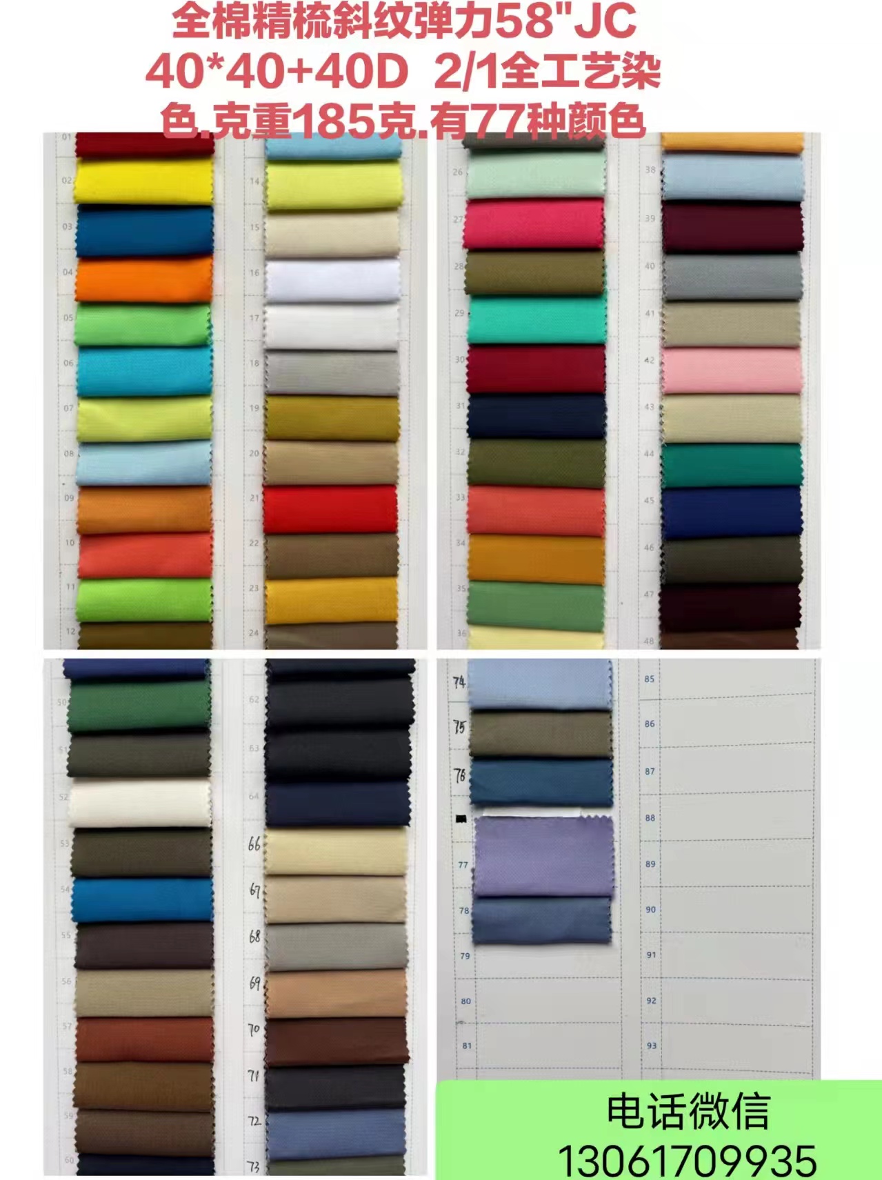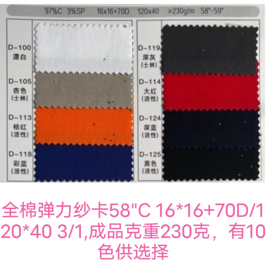 描述: 58“C 16x16+70D/120x40 3/1,全棉弹力纱卡染色成品布门幅:145CM克重230克/平方米,各项指标达到国标一等品,卷装,有18色供选择