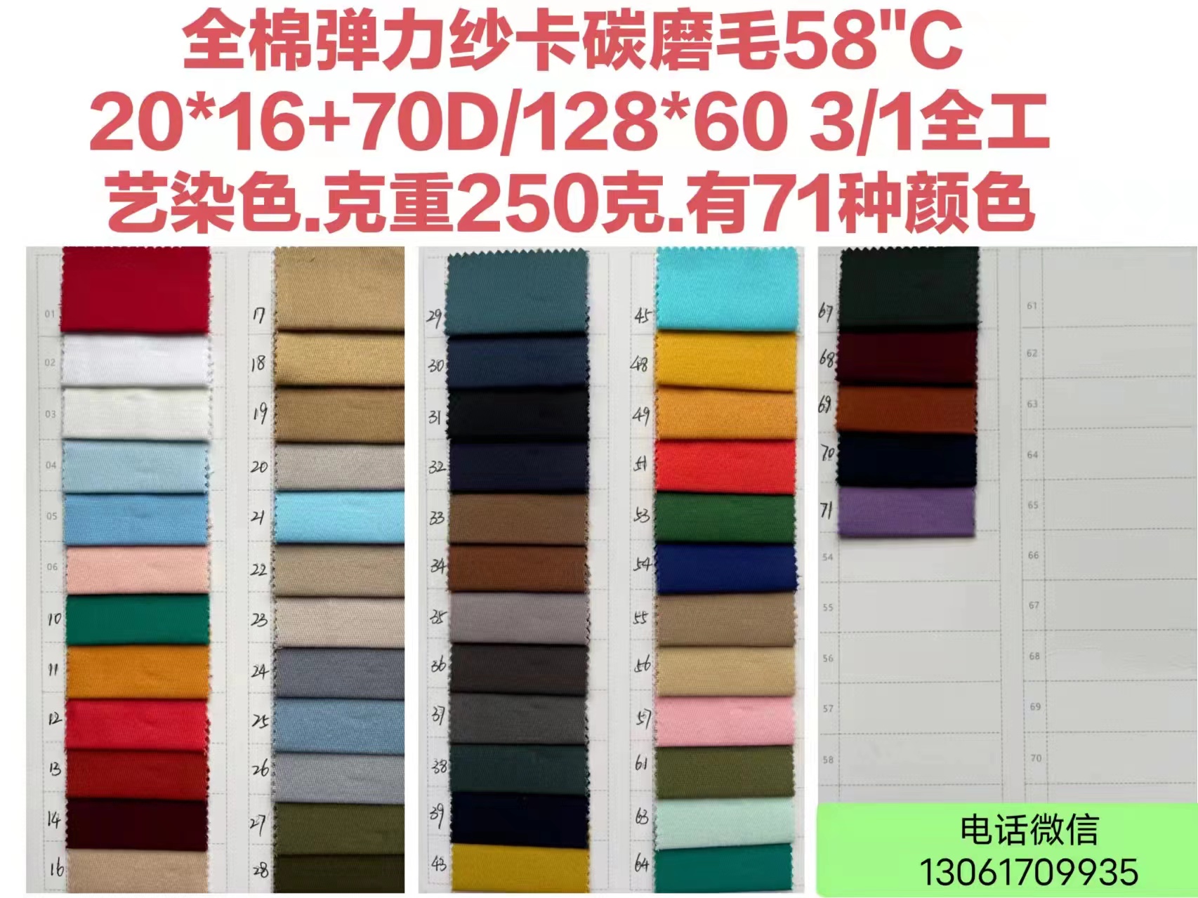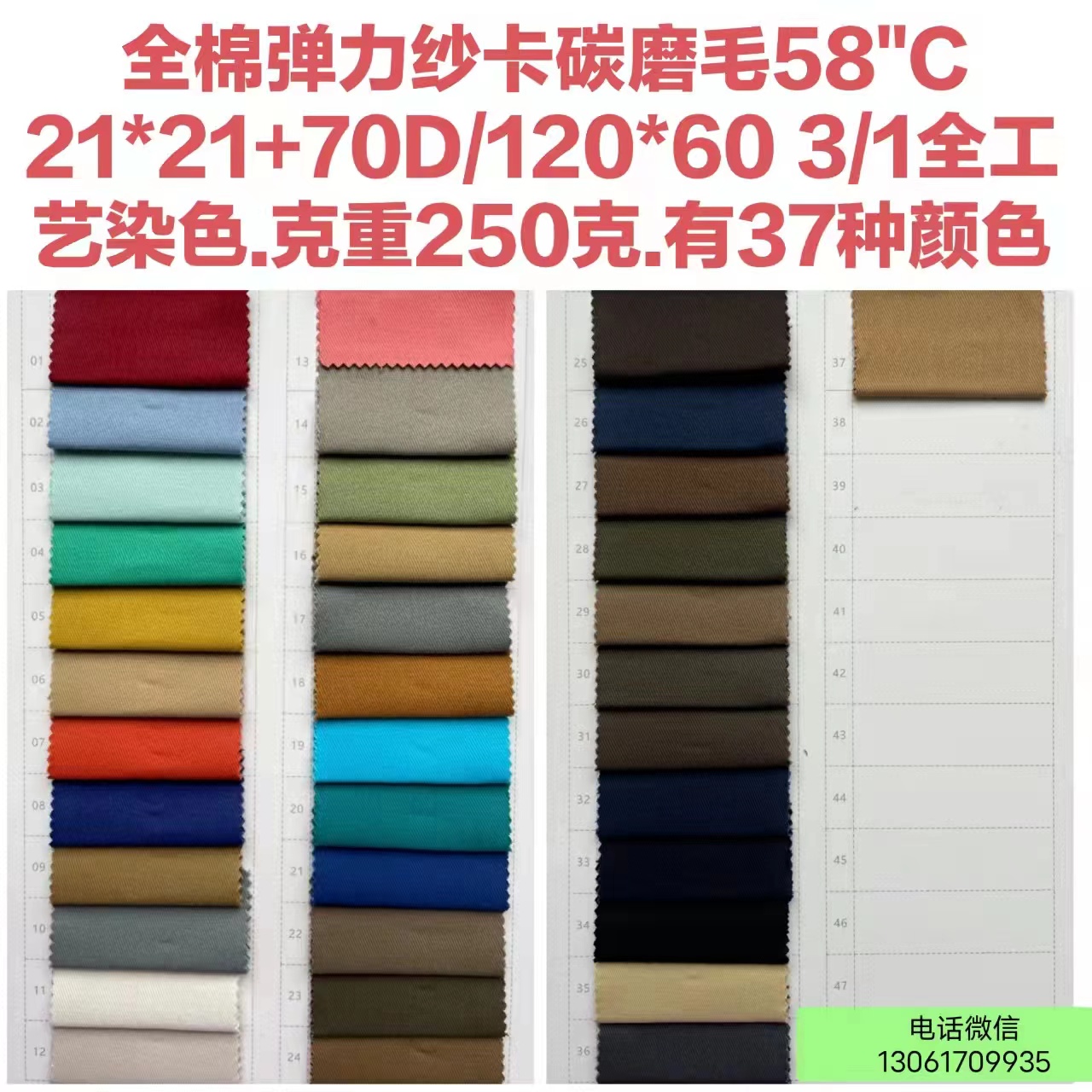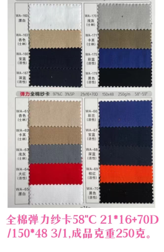 描述: 58“C 21x16+70D/150x48 3/1,全棉弹力纱卡染色成品布门幅:145CM克重250克/平方米,各项指标达到国标一等品,卷装,有14色供选择