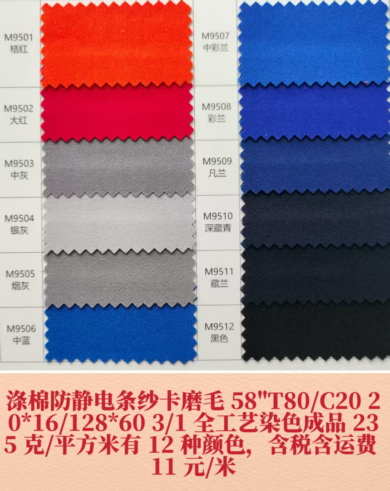 描述: 全棉21×16 弹力磨毛纱卡和不磨毛弹力纱卡:58“C98/SP2 21×16+70D 染色成品布克重 245g/m2、有 20 种现货颜色、执行标准 GB/T 411-2017(棉印染布)