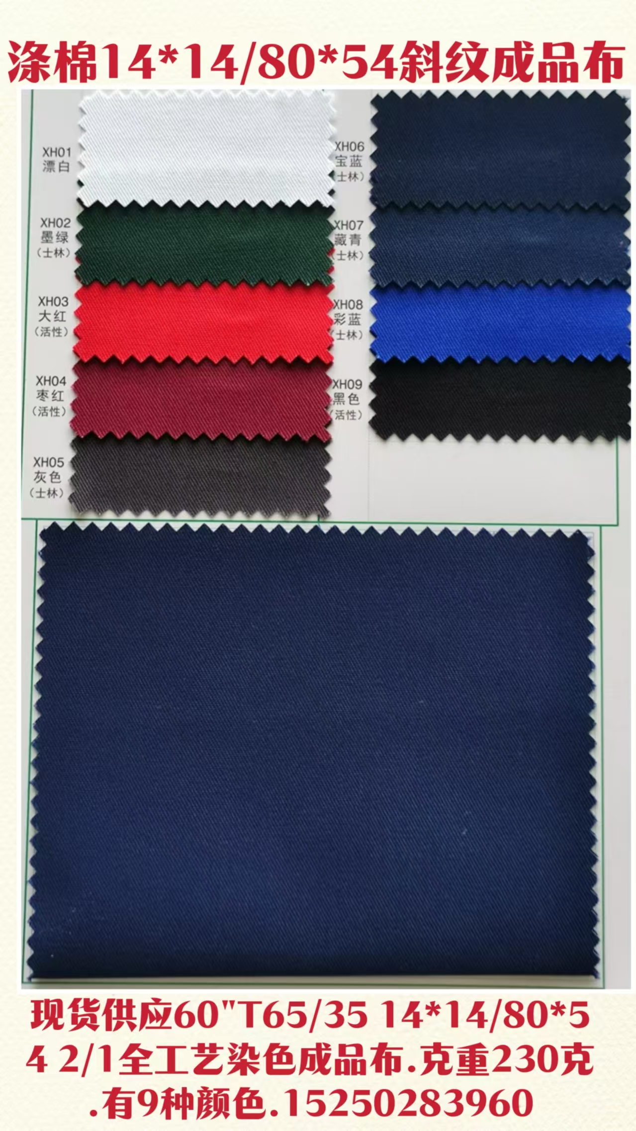 描述: 现货供应双经双纬涤棉弹力帆布58”T65/C35 21+21x16+70D+16+70D/90x54 1/1 全工艺染色成品布.克重235克.士林染色有30种颜色.含税价格15.7元/米