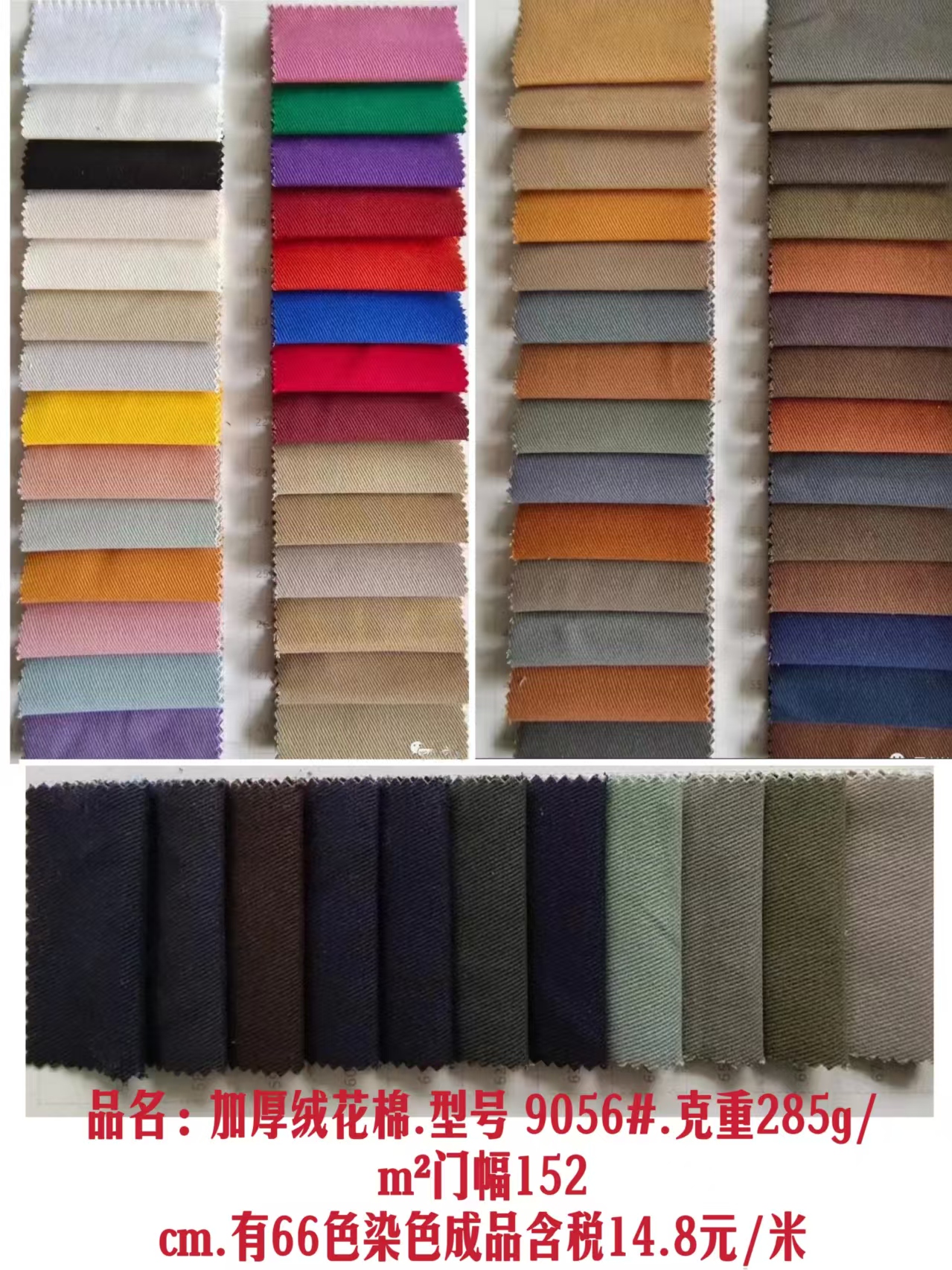 描述: 品名:加厚绒花棉.型号 9056#.克重285g/m2门幅152 cm.有66色染色成品含税14.8元/米