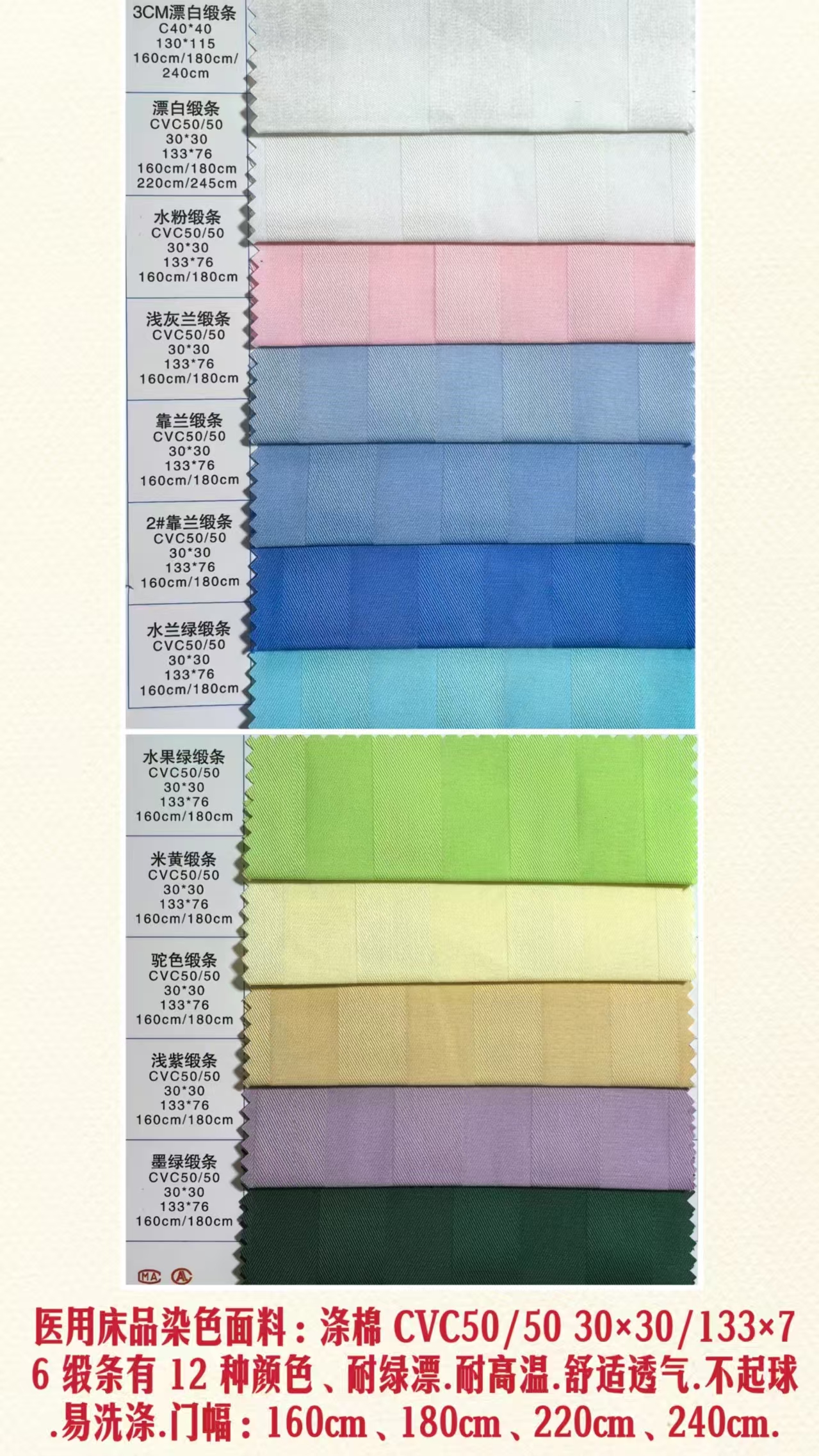 描述: 医用床品染色面料:涤棉 CVC50/50 30×30/133×76 缎条有 12 种颜色、耐绿漂.耐高温.舒适透气.不起球.易洗涤.门幅:160cm、180cm、220cm、240cm.