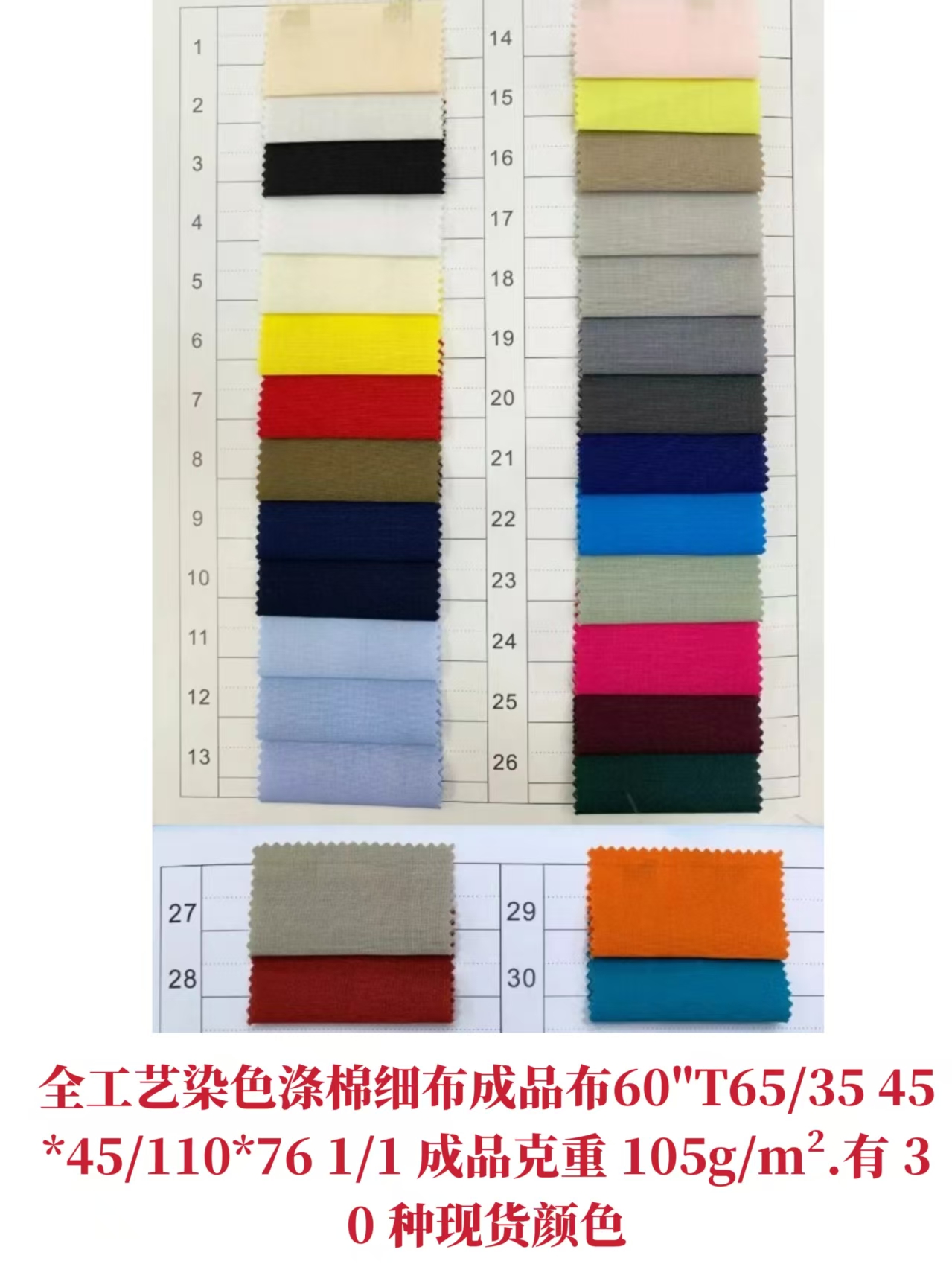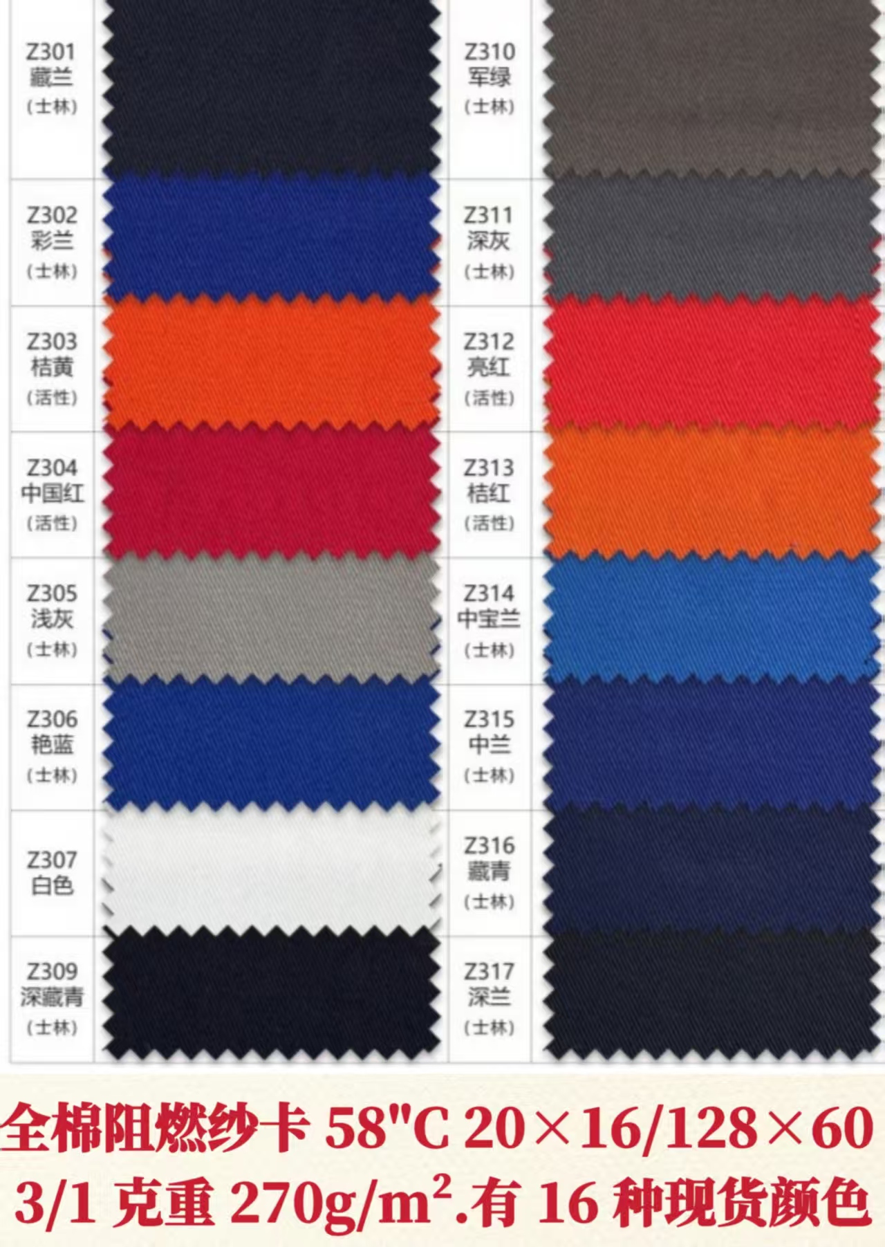 描述: 全棉21×16 弹力磨毛纱卡和不磨毛弹力纱卡:58“C98/SP2 21×16+70D 染色成品布克重 245g/m2、有 20 种现货颜色、执行标准 GB/T 411-2017(棉印染布)