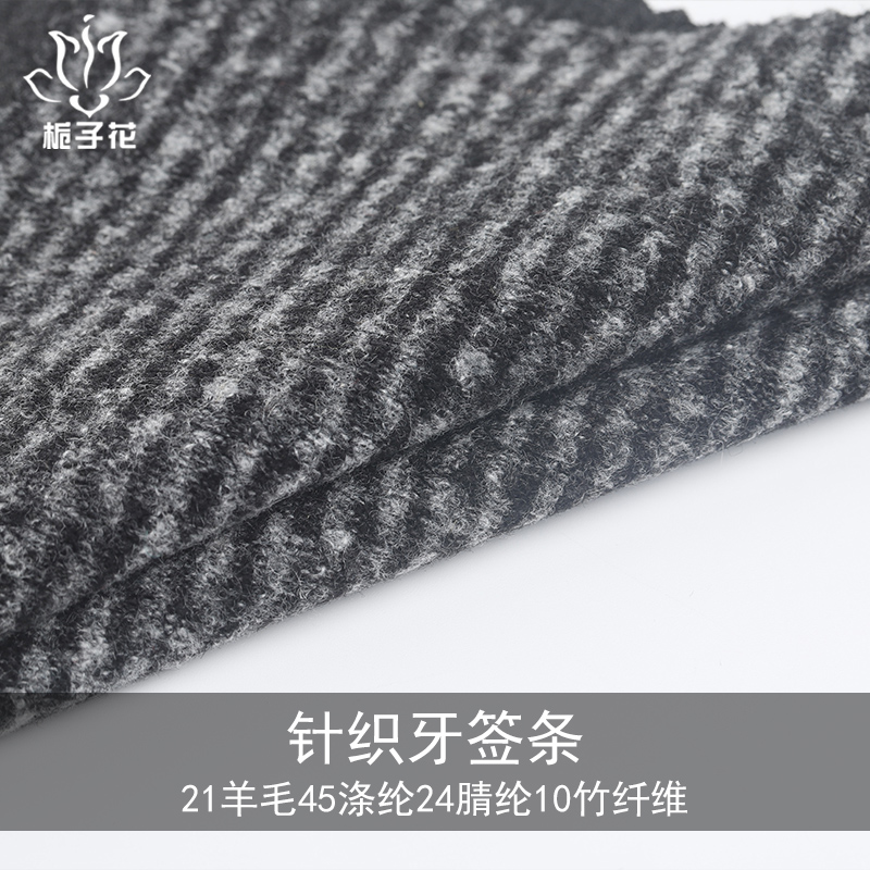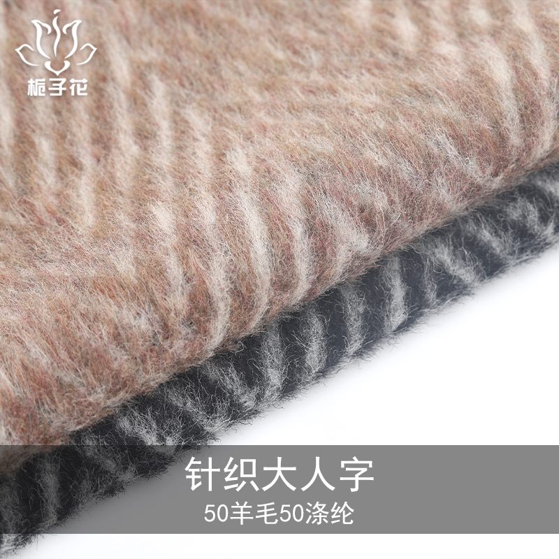描述: 毛呢针织面料是一种纯羊毛或者含羊毛的混纺面料。俗称呢绒或者是呢料。我们常见的混纺纤维有涤纶、锦纶、天丝、棉纱、腈纶、蚕丝等毛。一般常见的工艺有针织、梭织。针织服饰穿着舒适、贴身合体、无拘紧感、能充分体现人体曲线。毛呢针织面料因为其风格的贴身,穿着时尚感,所以越来越受人们的喜爱。这款50毛涤大人字纹针织面料,适用于制作秋冬大衣、风衣、裤裙、帽子、围巾、箱包等。