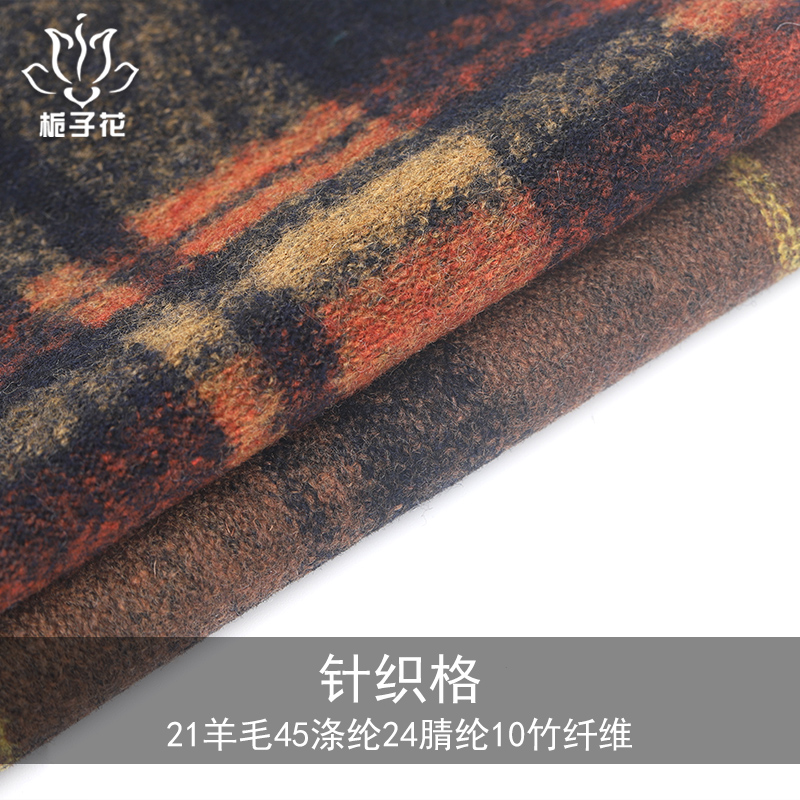描述: 毛呢针织面料是一种纯羊毛或者含羊毛的混纺面料。俗称呢绒或者是呢料。我们常见的混纺纤维有涤纶、锦纶、天丝、棉纱、腈纶、蚕丝等毛。一般常见的工艺有针织、梭织。针织服饰穿着舒适、贴身合体、无拘紧感、能充分体现人体曲线。毛呢针织面料因为其风格的贴身,穿着时尚感,所以越来越受人们的喜爱。这款针织格子呢布料,适用于制作秋冬大衣、风衣、裤裙、帽子、围巾、箱包等。