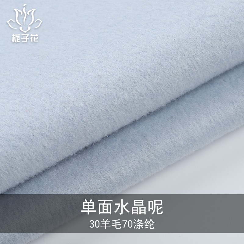 描述: 这款水晶顺毛呢布料颜色上很像中国传统汝窑的青瓷釉,素雅自然、纯净温润。低饱和度的色调比在视觉上能给人一种高级的轻奢质感。布料成分为30%羊毛和70%涤纶,在外观时尚的同时兼顾了耐用性。每米的630克的重量,厚薄适中、穿着不累赘。这款布料为生产厂家直销,省去所有中间环节,每米仅售30元。同时我们还提供个性定制服务,交期方面:小单只需15天、大货不超过30天,保证高效。现在联系客服还可以免费获取样布。