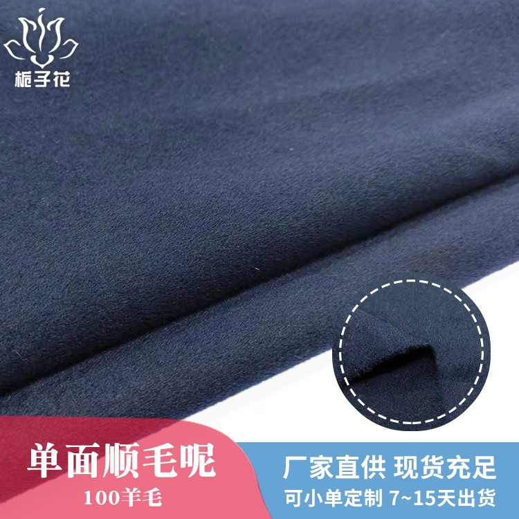 描述: 全羊毛面料,手感柔软而富有弹性,身骨挺括、不板、不烂。穿在身上垂坠感好,因弹性上佳所以耐穿性也是没得说的。有膘光感,颜色纯正,光泽自然柔和很有质感。纯羊毛面料用手紧握、抓捏松开后基本无折皱,有轻微折痕也可在短时间内褪去,很快恢复平整。双面呢是属于双层的面料,正反两面都是呢子的面料,面料双面相同,比较时尚,具有双面性的特点。由于正反两面都是毛呢缝制,做大衣不需要内衬,会更厚实,更挺括,平整不易起皱。顺毛呢是粗纺面料里的常规品种之一,由于表面的毛顺着一个方向的,有倒顺毛的,所以叫顺毛呢。毛呢面料吸湿性强、穿着舒适,它能吸收人体的排出的湿气,故穿着时感到干爽舒适 。