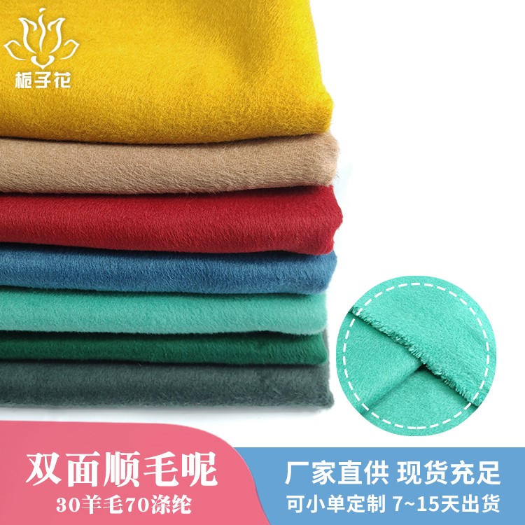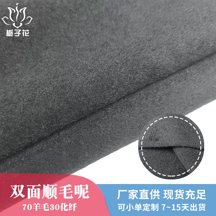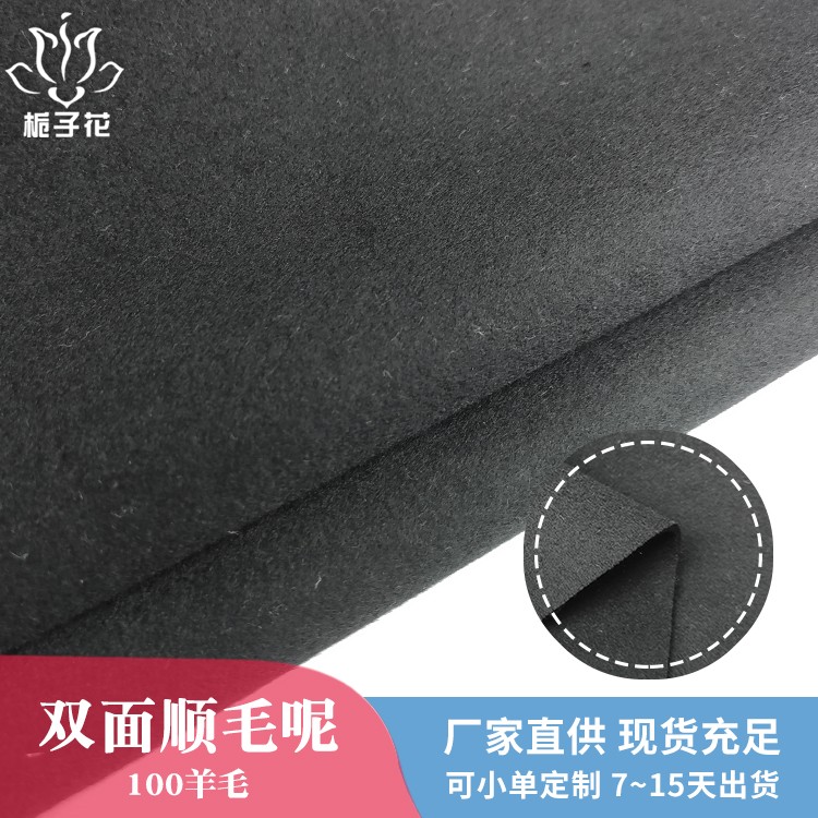 描述: 双面呢是属于双层的面料,正反两面都是呢子的面料,面料可以双面相同,也可以双面双色,比较时尚,具有双面性的特点。由于正反两面都是毛呢缝制,做大衣不需要内衬,会更厚实,更挺括,平整不易起皱。 顺毛呢是粗纺面料里的常规品种之一,由于表面的毛顺着一个方向的,有倒顺毛的,所以叫顺毛呢。毛呢面料吸湿性强、穿着舒适,毛呢面料吸湿性很强,它能吸收人体的排出的湿气,故穿着时感到干爽舒适 。羊毛纤维较粗,有挺阔、轻便、保暖的优点,所以更适合做外套。