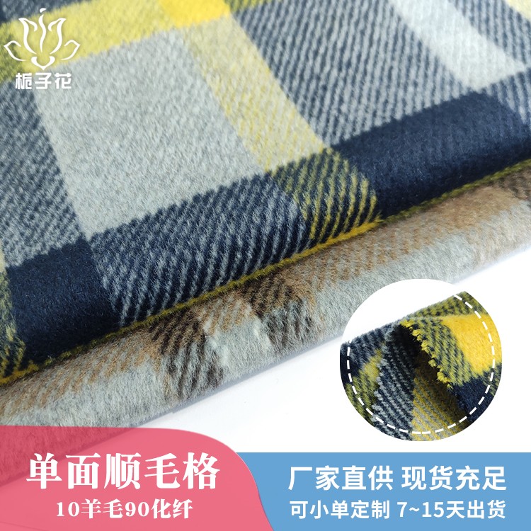 描述: 格子面料在生活当里极其常见并且运用也是比较广泛的,不管你是喜欢日系风,还是喜欢欧美风,格子面料都可以做到,而格子面料也可以强烈的表达设计师想要呈现的风格,格子有大有小,有粗有细,颜色也五光十色,常用来作为窗帘,桌布,裤装可裙装等,既美丽时尚,又高雅迷人。 顺毛呢是粗纺面料里的常规品种之一,由于表面的毛顺着一个方向的,有倒顺毛的,所以叫顺毛呢。毛呢面料吸湿性强、穿着舒适,毛呢面料吸湿性很强,它能吸收人体的排出的湿气,故穿着时感到干爽舒适 。羊毛纤维较粗,有挺阔、轻便、保暖的优点,所以更适合做外套。