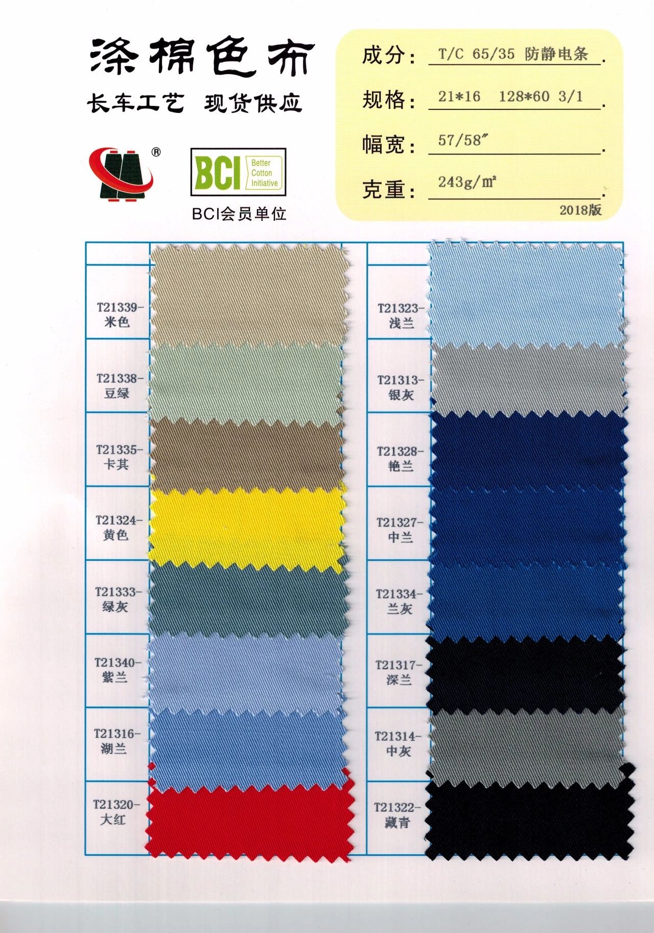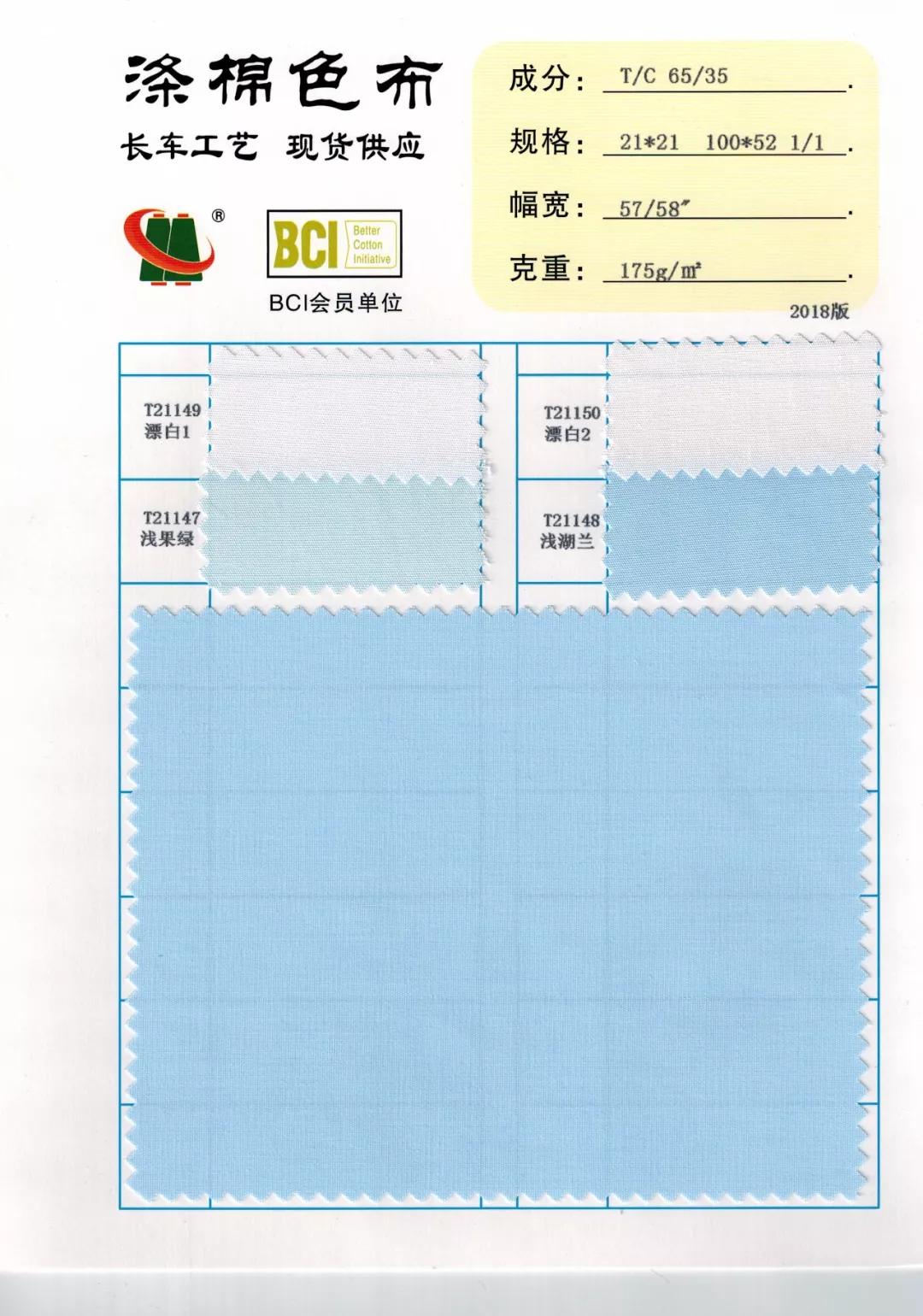 描述: 58“ T65/C35 21x21/108x58 3/1染色,长车全工艺,有16种颜色