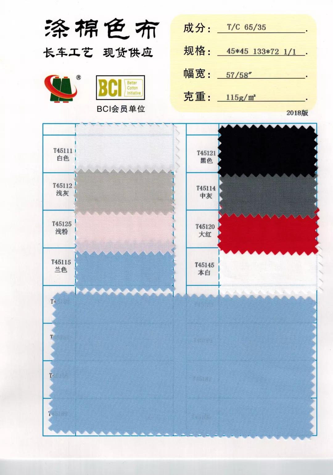 描述: 58“ T65/C35 45*45 133*72 平纹/斜纹染色,长车全工艺,有16种颜色
