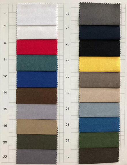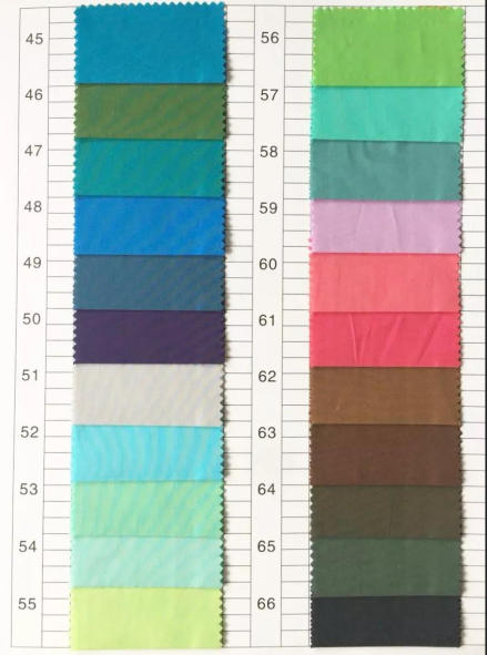 描述: 58“ T65/C35 21*21 100*52 纱绢1/1染色,长车全工艺,有16种颜色